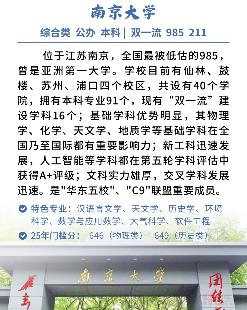 在一个多世纪的办学历程中,南京大学及其前身与时代同呼吸、与民族共命运,谋国家之强盛、求科教之进步,为国家的富强和民族的振兴做出了重要的贡献。尤其是改革开放以来,作为教育部直属的重点综合性大学,南京大学在崭新的历史机遇中焕发出新的生机,首批入选国家“211工程”和“985工程”建设序列,首批入选国家“双一流”建设高校,首批入选国家级双创示范基地,始终处于中国大学的第一方阵,获得了公认的社会影响和学术声誉。