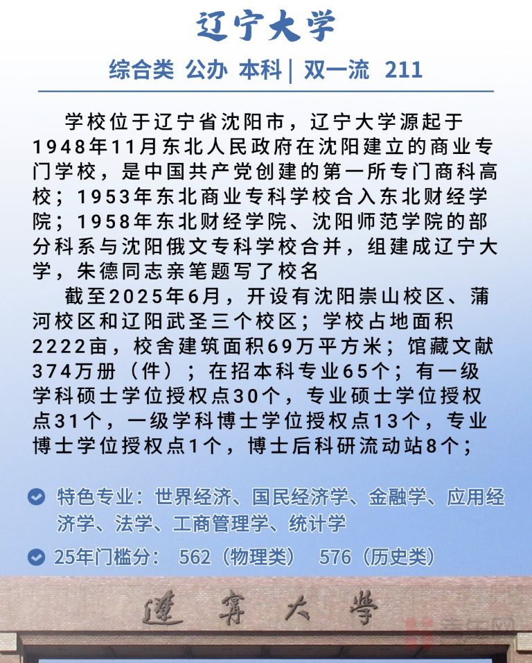 辽宁大学是一所具备文、史、哲、经、管、法、理、工、医、艺等学科门类的综合性大学,是国家“211工程”重点建设院校和国家“双一流”建设高校,入选教育部基础学科系列“101计划”。学校现有三个校区,即沈阳崇山校区、沈阳蒲河校区和辽阳武圣校区。学校占地面积2222亩,校舍建筑面积73万平方米。
