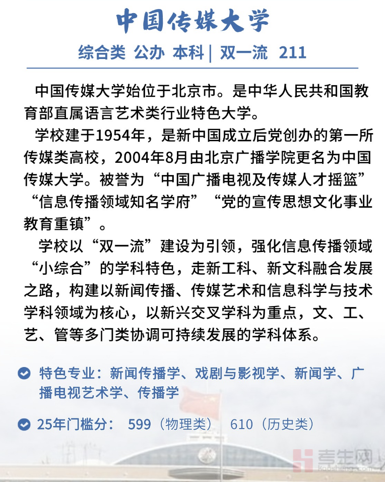 中国传媒大学是教育部直属的首批 “双一流” 建设高校,“211 工程” 重点建设大学,“985 优势学科创新平台” 重点建设高校。学校始建于 1954 年,是在刘少奇、周恩来等老一辈党和国家领导人直接关怀下建立的,新中国成立后党创办的第一所传媒类高校,2004 年 8 月由北京广播学院更名为中国传媒大学。办学 70 年来,学校秉承 “立德、敬业、博学、竞先” 的校训,传承 “忠诚、自信、包容、竞先” 的文化基因,以培养 “弘道崇德、经世致用” 的传媒人为己任,培养造就了大批党和国家所需、能够应对未来媒体挑战、驰骋于国际舞台的优秀传媒人才,为党和国家的传媒事业以及经济社会发展作出了重要贡献,被誉为 “中国广播电视及传媒人才摇篮”“信息传播领域知名学府”“党的宣传思想文化事业教育重镇”。
