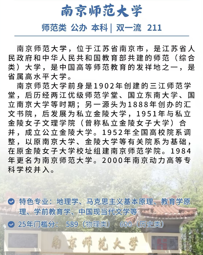 南京师范大学是国家“双一流”建设高校和江苏高水平大学建设高校。学校的主源可追溯到1902年创办的三江师范学堂,该学堂是中国高等师范教育的发祥地之一。后历经两江优级师范学堂、南京高等师范学校、国立东南大学、国立第四中山大学、江苏大学、国立中央大学、国立南京大学等时期;其另一源头为1888年创办的汇文书院,后发展为金陵大学,1951年与金陵女子文理学院(曾称金陵女子大学)合并,成立公立金陵大学。1952年全国高校院系调整,在原南京大学、公立金陵大学等有关院系的基础上组建南京师范学院,校址设在原金陵女子大学校址。1984年改办成南京师范大学。1996年进入国家“211工程”高校行列。2000年南京动力高等专科学校并入。2015年成为江苏省与教育部共建高校。2017年入选国家首批“双一流”建设高校。2018年成为教育部与江苏省共建“双一流”建设高校。2021年入选江苏高水平大学建设高峰计划A类建设高校。2022年入选国家第二轮“双一流”建设高校。目前,学校正在着力建设“特色鲜明、有国际影响的一流大学”。