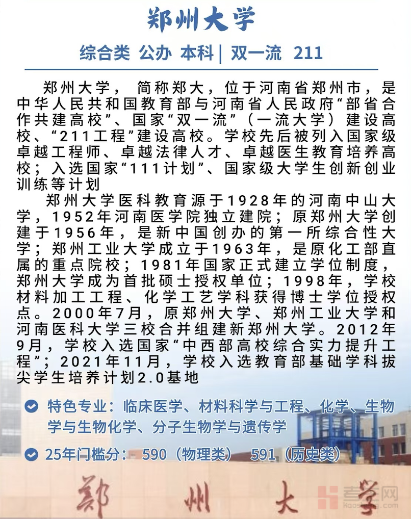 郑州大学是国家“211工程”重点建设高校、“双一流”建设高校和部省合建高校。校党委是全国先进基层党组织,学校入选教育部第三批“全国党建工作示范高校”。站在新的历史起点上,学校确立了高水平研究型大学办学定位,围绕一流大学建设中长期任务与“221”战略,坚持内涵式、高质量、可持续发展,到2035年力争进入世界一流大学行列。