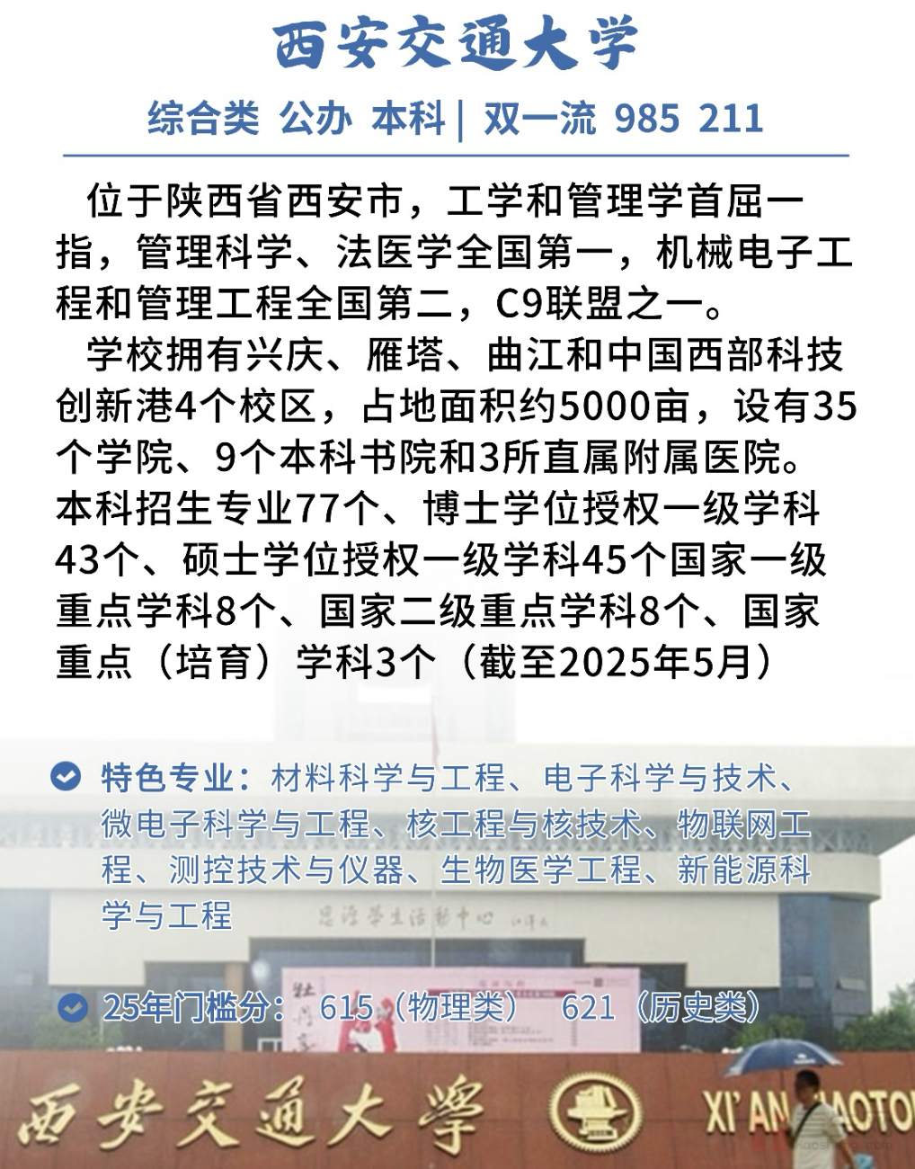 学校是“七五”“八五”重点建设单位,首批进入国家“211”和“985”工程建设学校。2017 年入选国家一流大学建设名单A类建设高校,2022年入选国家第二轮“双一流”建设高校,8个学科入选国家“双一流”建设学科,12个学科入选陕西省“双一流”建设学科。据 2024年1月ESI公布的数据,学校19个学科进入世界学术机构前 1%,6个学科进入前1‰,其中工程学进入前万分之一,排名全球第9。