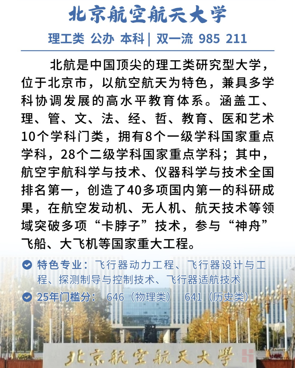 作为新中国第一所航空航天高等学府,北航萌发于民族觉醒之时,诞生于国家奋发之际,成长于民族复兴之中。从航空救国到航空报国、航天报国,再到服务航空强国、航天强国建设,学校始终传承红色基因,把服务国家作为最高追求,矢志不渝培养一流人才,打造国之重器,始终奋进在中国高等教育第一方阵前列。100位两院院士和27万余名优秀建设者从这里走出,践行“德才兼备,知行合一”的校训,弘扬“艰苦朴素、勤奋好学、全面发展、勇于创新”的校风,研制发射(试飞)成功的多种型号飞行器填补了国内多项空白,谱写出了一篇篇培育栋梁、为国铸剑、追求卓越的绚丽华章。
