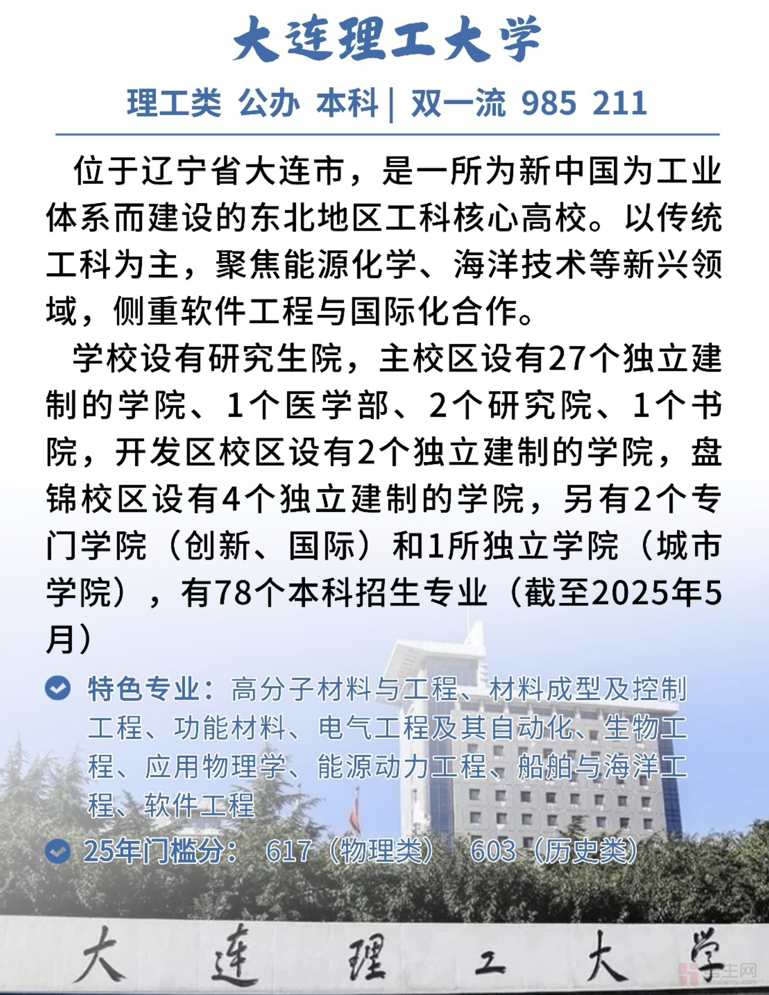 大连理工大学是教育部直属全国重点大学,是国家“211工程”和“985工程”重点建设高校,也是世界一流大学A类建设高校。学校以培养精英人才、促进科技进步、传承优秀文化、引领社会风尚为宗旨,秉承“海纳百川、自强不息、厚德笃学、知行合一”为基本特质的大工精神,致力于创造、发现、传授、保存和应用知识,勇于担当社会责任,服务国家,造福人类。