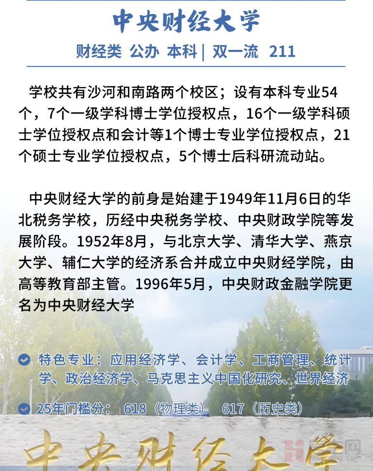 学校始建于1949年11月6日,创办之初由财政部主管,历经中央税务学校、中央财政学院、中央财经学院、中央财政金融学院等发展阶段,1996年更名为中央财经大学,2000年由财政部划转教育部直属管理,2005年成为国家“211工程”重点建设高校,2006年成为国家首批“985优势学科创新平台”项目建设高校,2012年成为教育部、财政部和北京市人民政府共建高校,2017年成为国家“双一流”建设高校。
