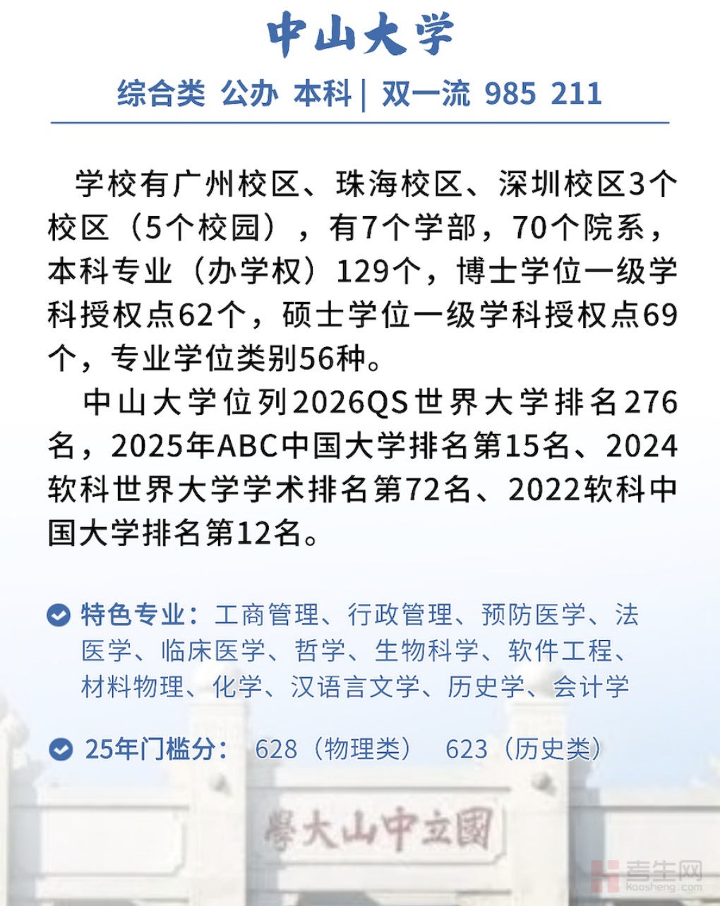 今日的中山大学,由1952年院系调整后分设的中山大学和中山医科大学于2001年10月合并而成。通过部省共建,在国家、地方和社会的大力支持下,中山大学成为一所国内一流、国际知名的现代综合性大学,形成了综合性、研究型、开放式的办学特质。
