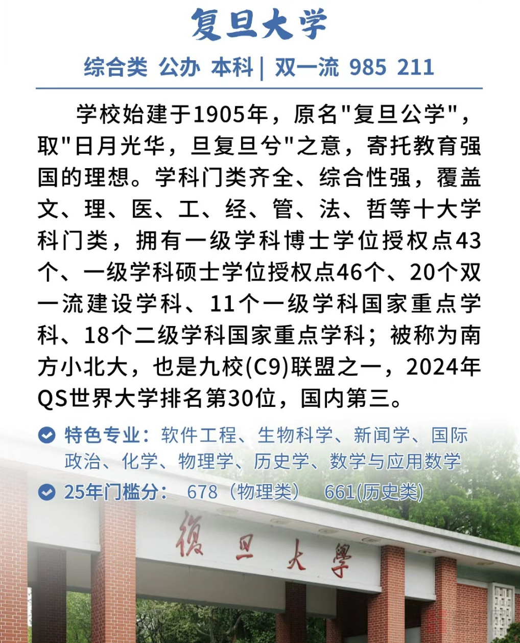 复旦大学校名取自《尚书大传》之“日月光华,旦复旦兮”,始创于1905年,原名复旦公学,1917年定名为复旦大学,是中国人自主创办的第一所高等院校。上海医科大学前身是1927年创办的国立第四中山大学医学院。2000年,复旦大学与上海医科大学合并。目前,学校拥有哲学、经济学、法学、教育学、文学、历史学、理学、工学、医学、管理学、艺术学、交叉学科等12个学科门类;2021年,学校20个学科入选第二轮“双一流”建设学科,比首轮增加3个入选学科。