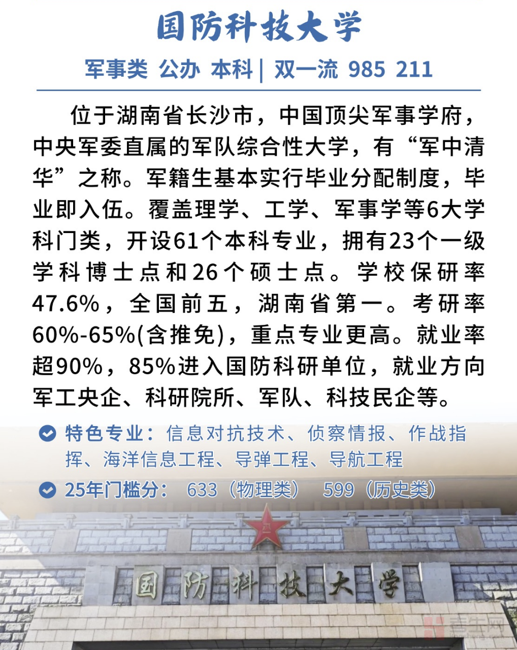 国防科技大学,前身是1953年创建于哈尔滨的中国人民解放军军事工程学院,即著名的“哈军工”,陈赓大将任首任院长兼政治委员。“哈军工”创办于抗美援朝期间,是新中国第一所高等军事工程学院,其卓越的办学成效铸就了我国国防科技和高等教育史上一座丰碑。1970年,学院主体南迁长沙,改名为长沙工学院。1978年,改建为中国人民解放军国防科学技术大学。1999年,长沙炮兵学院、长沙工程兵学院和长沙政治学院并入国防科学技术大学。2017年,中央军委决策,以国防科学技术大学、国际关系学院、国防信息学院、西安通信学院、电子工程学院,以及理工大学气象海洋学院为基础,并将军委装备发展部第63研究所划入,重建国防科技大学,归军委建制领导。