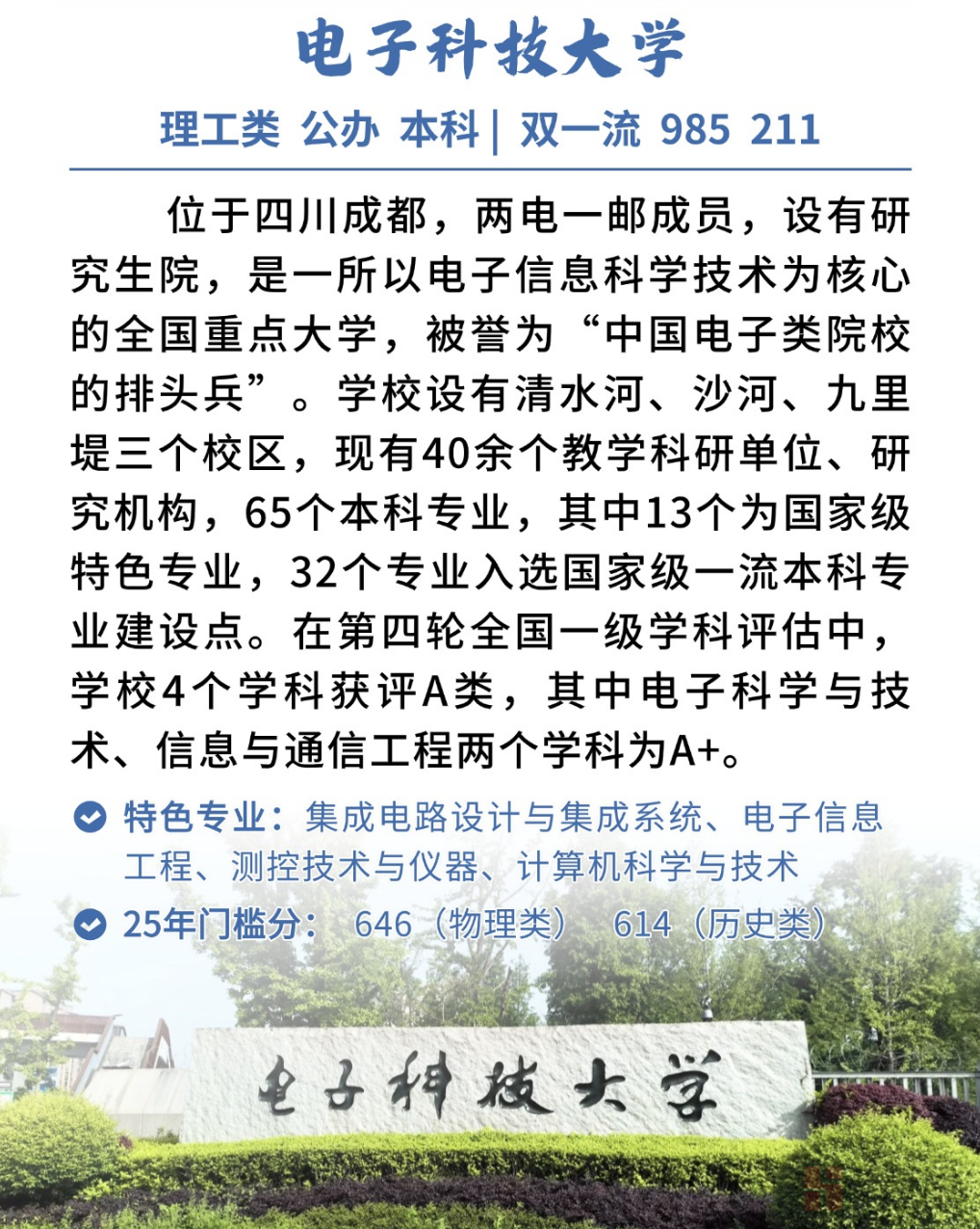 学校1960年被中共中央列为全国重点高等学校,1961年被中共中央确定为七所国防工业院校之一,1988年更名为电子科技大学,1997年被确定为国家首批“211工程”建设的重点大学,2000年由原信息产业部主管划转为教育部主管,2001年进入国家“985工程”重点建设大学行列,2017年进入国家建设“世界一流大学”A类高校行列。2019年教育部和四川省签约共同推进我校世界一流大学建设。2022年入选国家第二轮“双一流”建设高校名单。经过60余年的建设,学校形成了多层次、多类型的人才培养格局,成为一所完整覆盖整个电子信息类学科,以电子信息科学技术为核心,以工为主,理工渗透,理、工、管、文、医协调发展的多科性研究型大学,成长为国内电子信息领域高新技术的源头,创新人才的基地。
