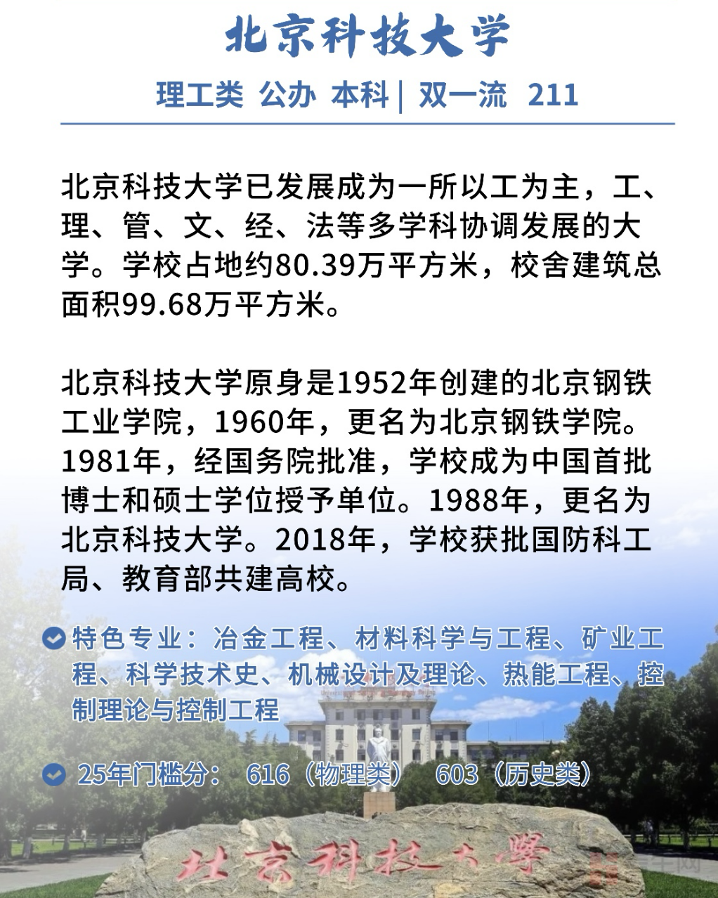 1960年,更名为北京钢铁学院,并被批准为全国重点高等学校。1984年,成为全国首批正式成立研究生院的高等学校之一。1988年,更名为北京科技大学。1997年5月,学校首批进入国家“211工程”建设高校行列。2006年,学校成为首批“985工程”优势学科创新平台建设高校。2014年,学校牵头的“钢铁共性技术协同创新中心”成功入选国家“2011计划”。2017年,学校入选国家“双一流”建设高校。2018年,学校获批国防科工局、教育部共建高校。目前,学校已发展成为一所以工为主,工、理、管、文、经、法等多学科协调发展的教育部直属全国重点大学。