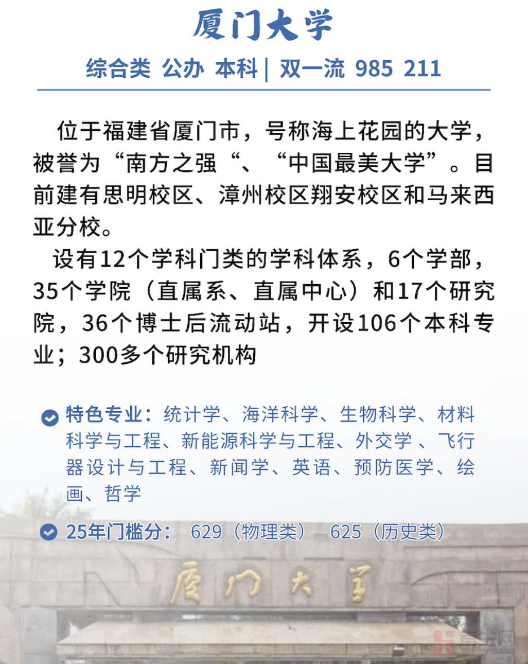 学校发挥“侨、台、特、海”区位优势,彰显“海峡、海丝、海洋”办学特色,先后进入全国重点大学、“211工程”、“985工程”和“双一流”建设高校行列。学校建有思明校区、漳州校区、翔安校区和马来西亚分校,设有6个学部、35个学院(直属系、直属中心)和17个研究院,形成了覆盖哲学、经济学、法学、教育学、文学、历史学、理学、工学、医学、管理学、艺术学、交叉学科12个学科门类的学科体系,设有36个博士后流动站。2022年,学校入选国家公布的第二轮“双一流”建设高校名单,化学、生物学、海洋科学、生态学、统计学、教育学共6个学科入选第二轮“双一流”建设学科名单。在全国新一轮学科评估中,高峰学科、优势学科数量实现倍增,取得历史最好成绩。