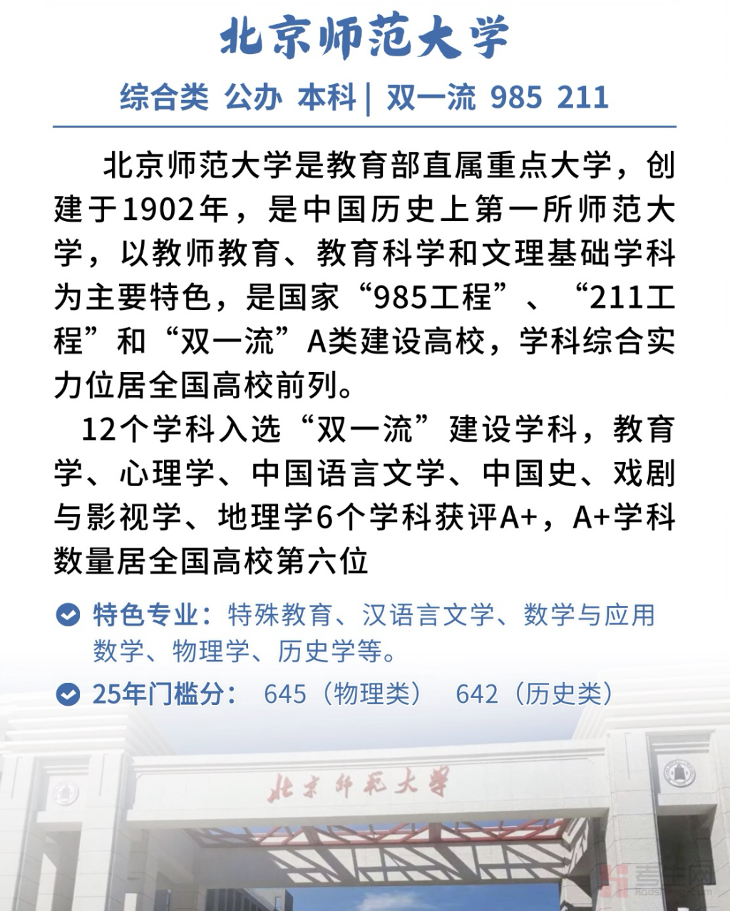 北京师范大学是教育部直属重点大学,是一所以教师教育、教育科学和文理基础学科为主要特色的著名学府。学校的前身是1902年创立的京师大学堂师范馆,1908年改称京师优级师范学堂,独立设校,1912年改名为北京高等师范学校。1923年学校更名为北京师范大学,成为中国历史上第一所师范大学。1931年、1952年北平女子师范大学、辅仁大学先后并入北京师范大学。