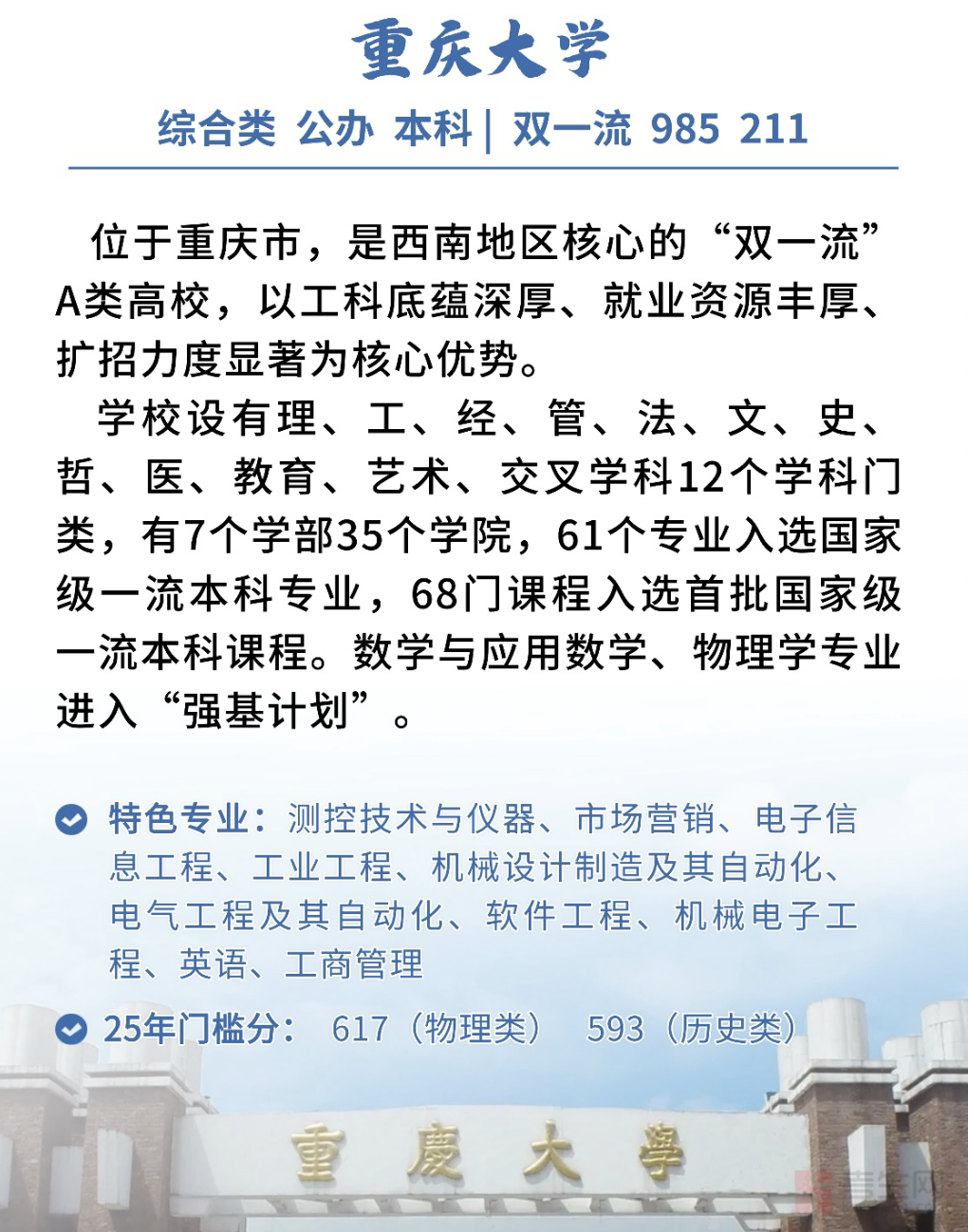 重庆大学是中央直管、教育部直属的全国重点大学。学校创办于1929年,提出建设“完备弘深之大学”的愿景,到20世纪40年代发展成为文理工商法医各学科齐全的综合性大学。